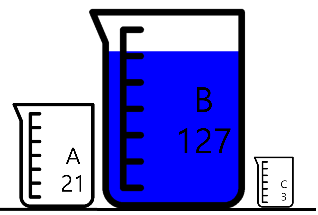 루친스의 실험에서는 세 가지 크기의 물병이 사용되었습니다. 각각 A(21단위), B(127단위), C(3단위)로 표시된 물병을 이용해 100단위의 물을 정확히 계량하는 방법을 찾도록 하는 과제가 주어졌습니다.