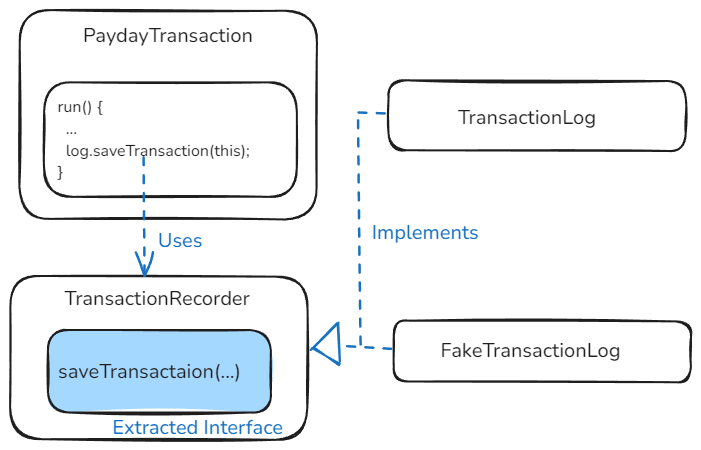 기존 코드에서는 PaydayTransaction이 TransactionLog에 직접 의존하였지만, 인터페이스 추출을 통해 이를 추상화하여 유연한 설계를 만들 수 있습니다.